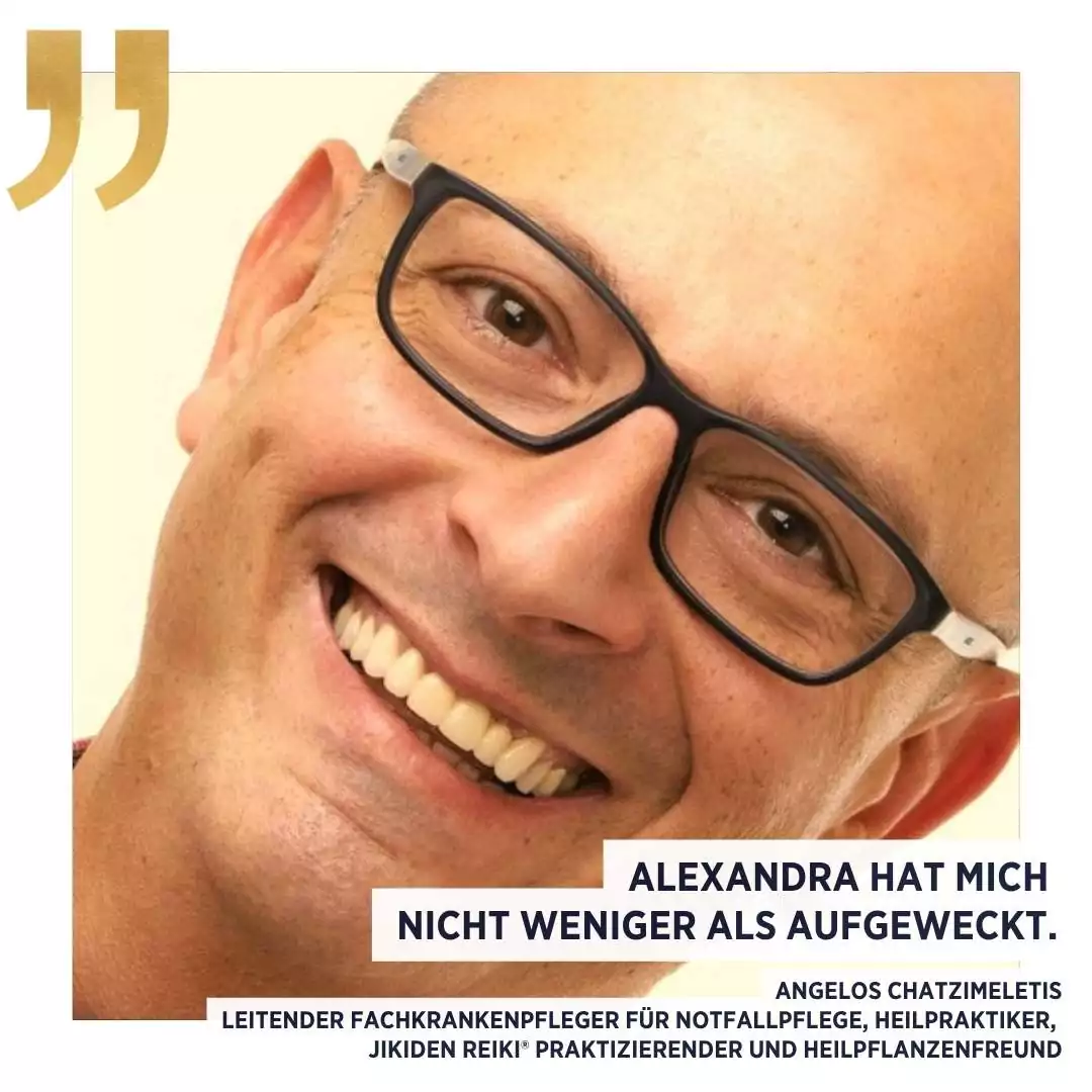 Alexandra hat mich nicht weniger als aufgeweckt. Das erste Mal bin ich auf Empfehlung zu ihr gekommen. Ich konnte mir nichts darunter vorstellen, und wusste auch nicht, was ich davon halten soll, ich war skeptisch. Ich war damals noch griechisch-orthodox, die Idee einer freien Spiritualität widersprach meinem Glauben. Angst war auch dabei. Zum Glück hat meine Neugierde gesiegt! Die Einfachheit die sie ausstrahlt, hat mich direkt beruhigt.